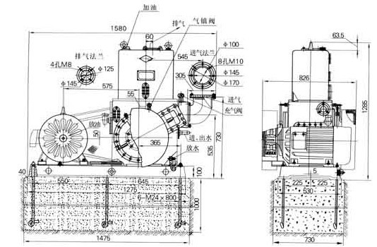 1、H滑閥式真空泵底座應(yīng)安裝在混凝土的基礎(chǔ)上,基礎(chǔ)的四周應(yīng)留有5至10厘米的槽溝,防止放油或放水時(shí)沾污工場(chǎng)。